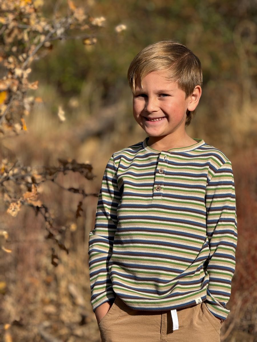 This green multi stripe henley features a soft, subtle design with a comfortable fit. Perfect for autumn, it adds a fresh touch of style to any casual wardrobe.