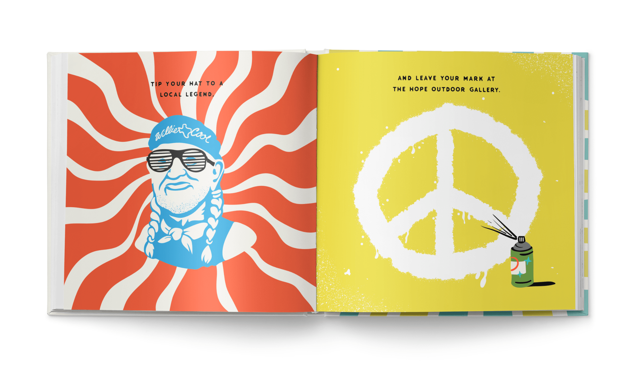 A series of bright, bold, graphic, Austin scenes, guide you through some of the places, people and things that have given Austin its soul and reputation as a purveyor of all things cool. And weird. Written for all the cool kids out there — from the littlest locals, to first-time trippers, and all of their grown-ups; the spirit of this book is about embracing YOUR weird and all the things that make you unique and crazy cool.