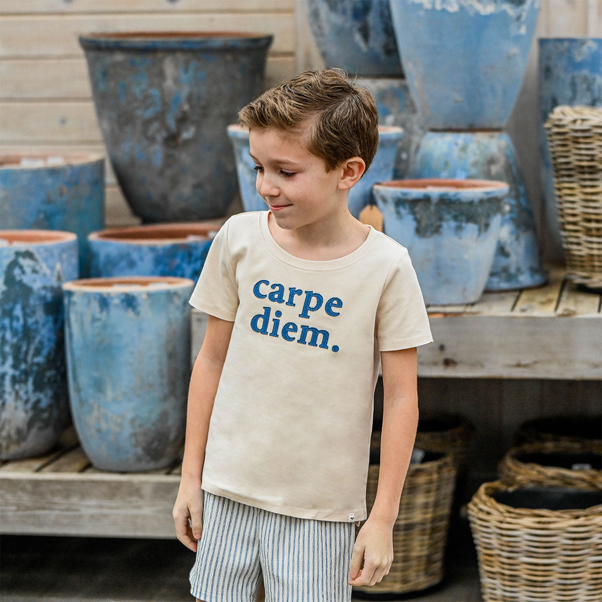 Seize the day in style with this laid-back tee! Featuring a charming "carpe diem." appliqué, this raw edge short sleeve shirt brings an effortless, cool-kid vibe to any outfit. Crafted in natural tones, it's perfect for everyday adventures—whether your little one is heading to school, the park, or just hanging out. Available in infant, toddler, and boy sizes. Designed in Minnesota.