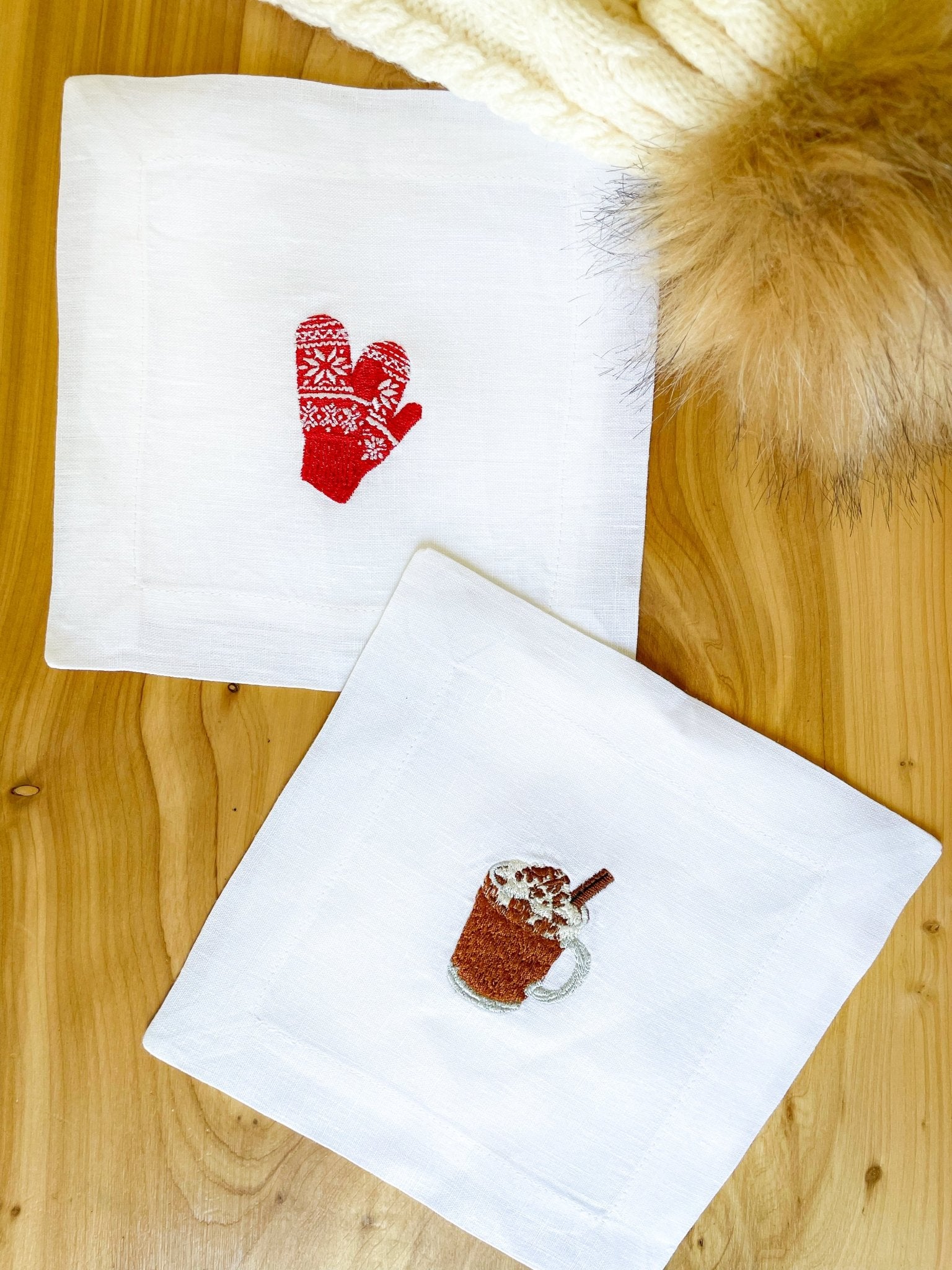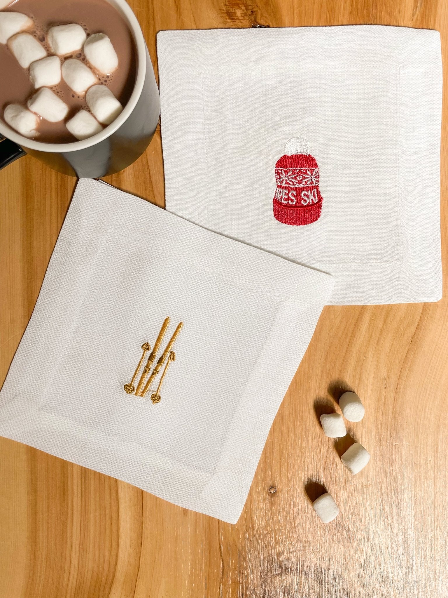 Introducing Lettermade’s newest cocktail napkin set: “Après Ski”! Featuring one of each design—Hot Cocoa, Red Mittens, Ski Hat with Après Ski motif, and Skis—this charming set brings a cozy alpine touch to your winter entertaining. Crafted from 100% pure white linen with detailed embroidery, it’s the perfect addition to holiday gatherings, cabin weekends, or après cocktails by the fire.
