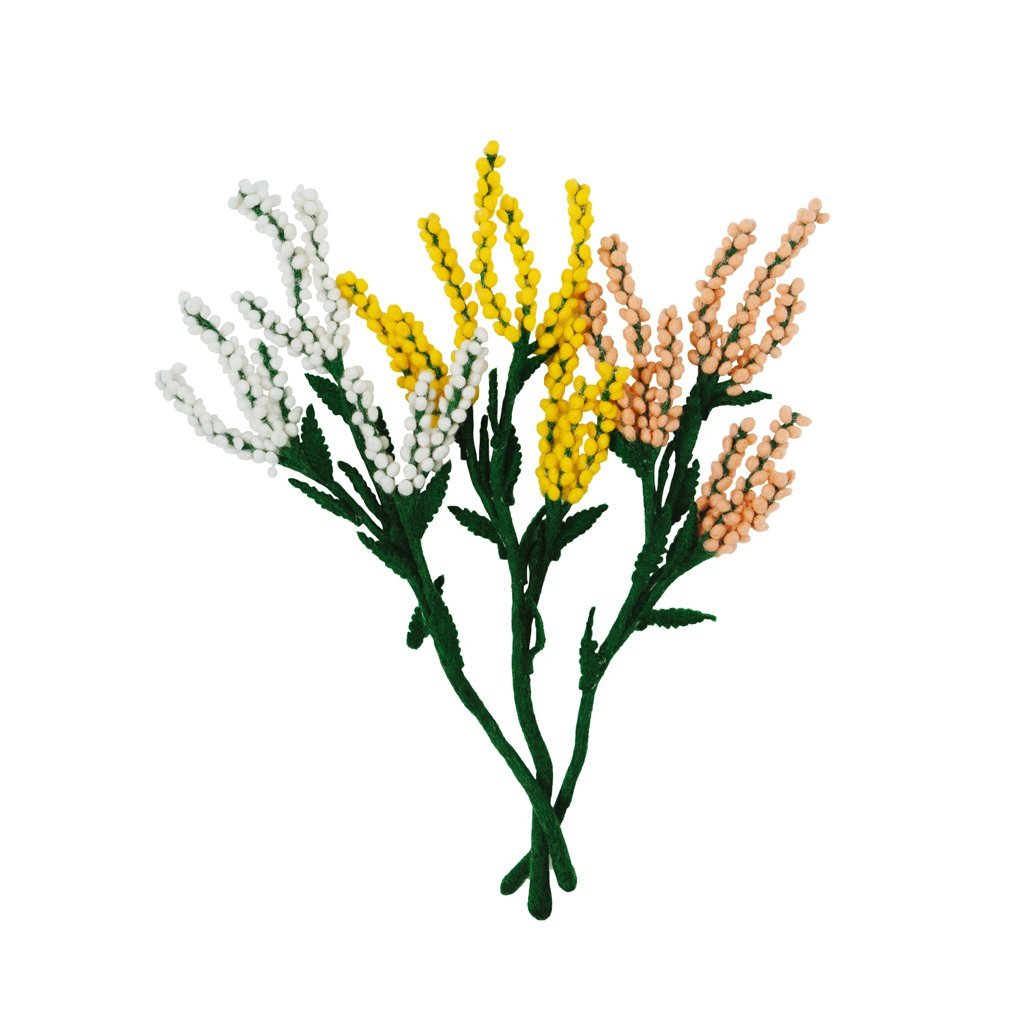 The long-awaited Felt Baby's Breath has been at the top of everyone's wish list for many seasons! Finally, we have the perfect bulky filler that can be added to beautiful bouquets, yet bold enough to display on its own. Experiment with a fun and bright store display with these beautiful stems, brimming with tiny colorful baubles. Available in yellow, white and peach. With a bendable wire stem, these flowers can be styled in their own vase or bunched together with green leaves. Each flower is dyed, cut, and stitched by hand in Nepal.