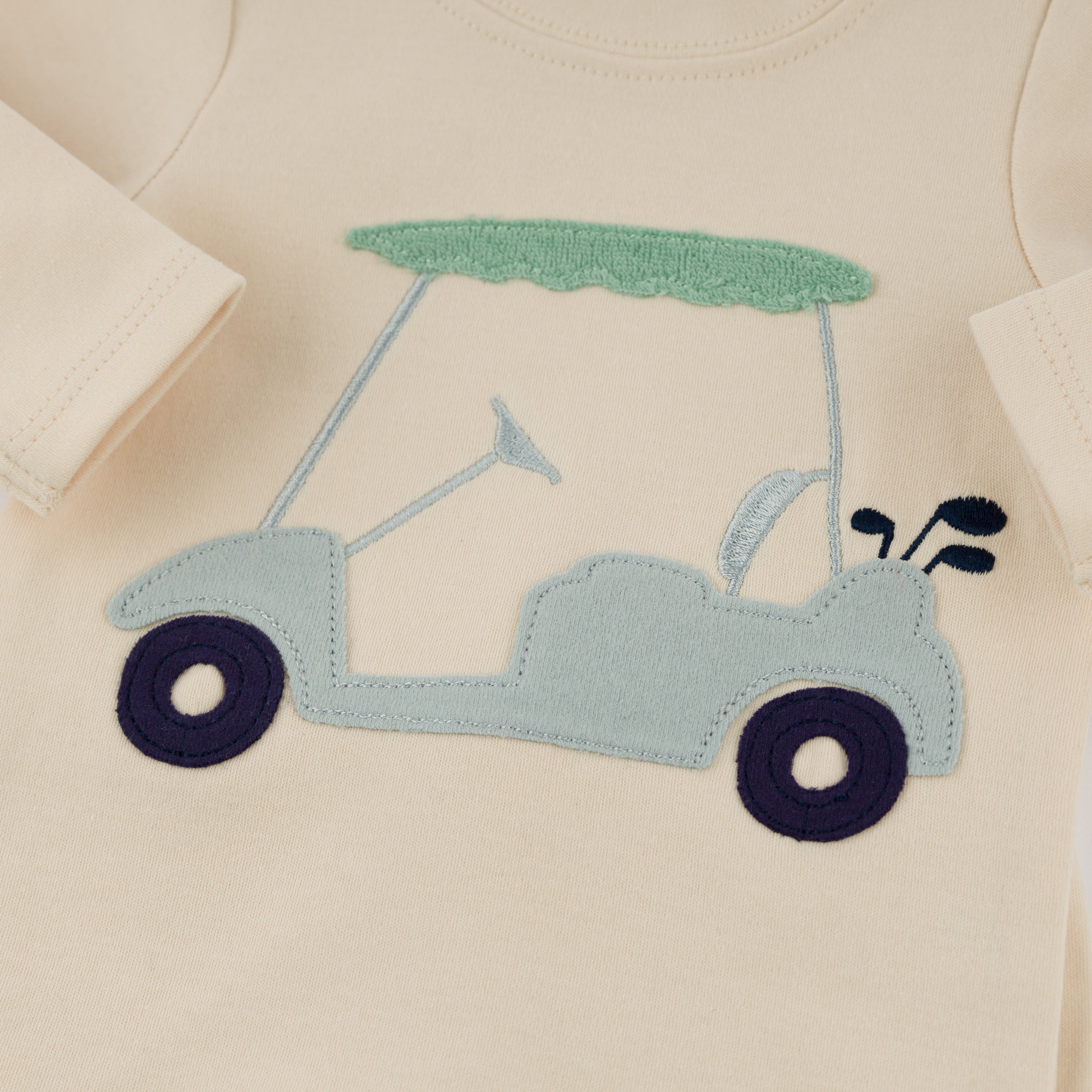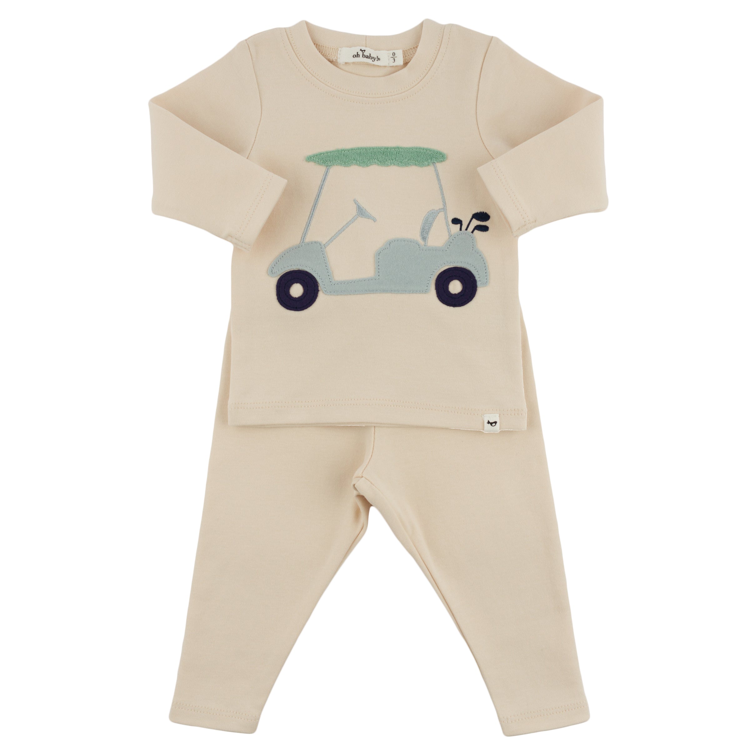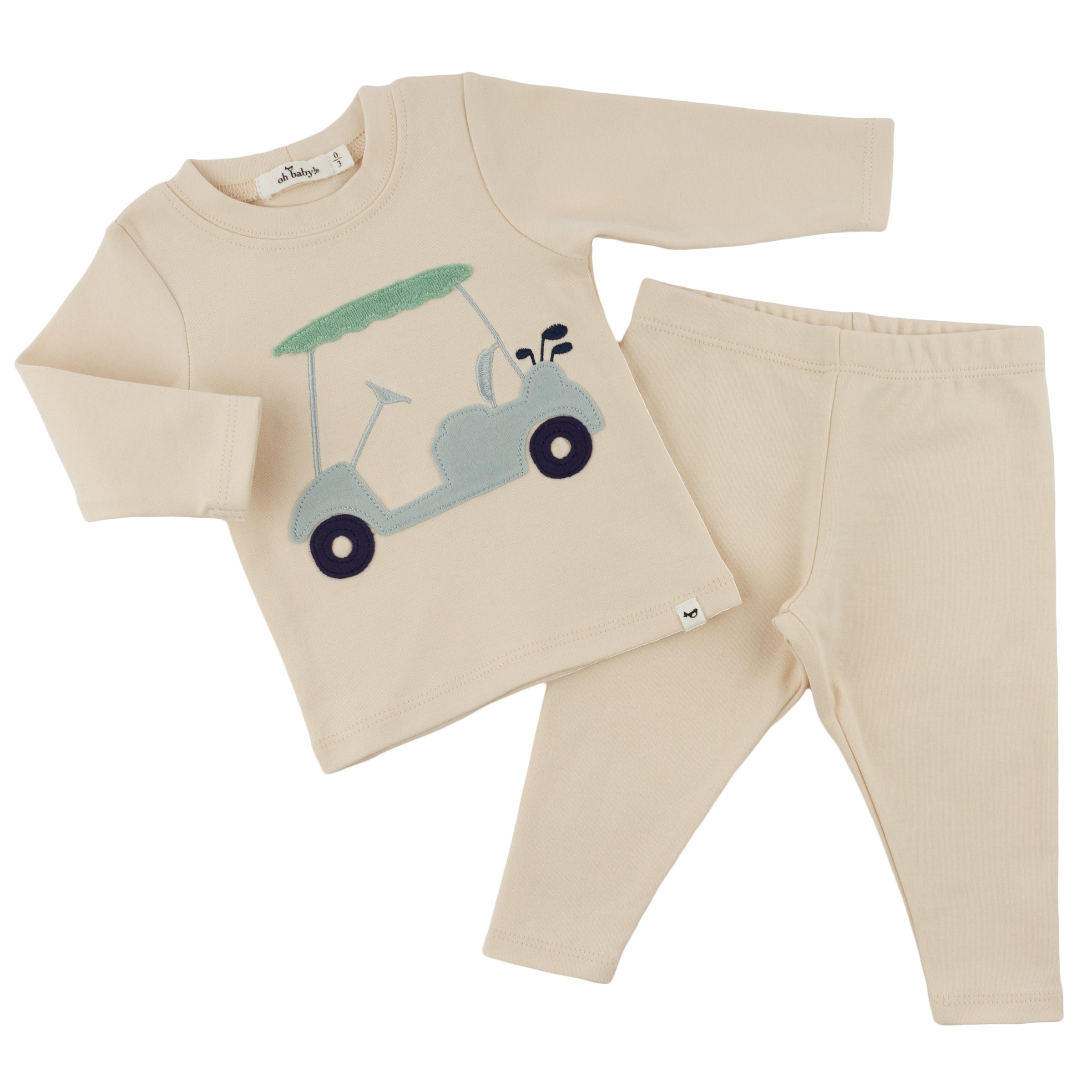 This cute baby boy outfit will have your little one looking stylish and feeling cozy in no time! This two piece set features a golf cart appliqué on a soft cotton long sleeve tee with matching pants. Available in infant sizes. Designed in Minnesota.