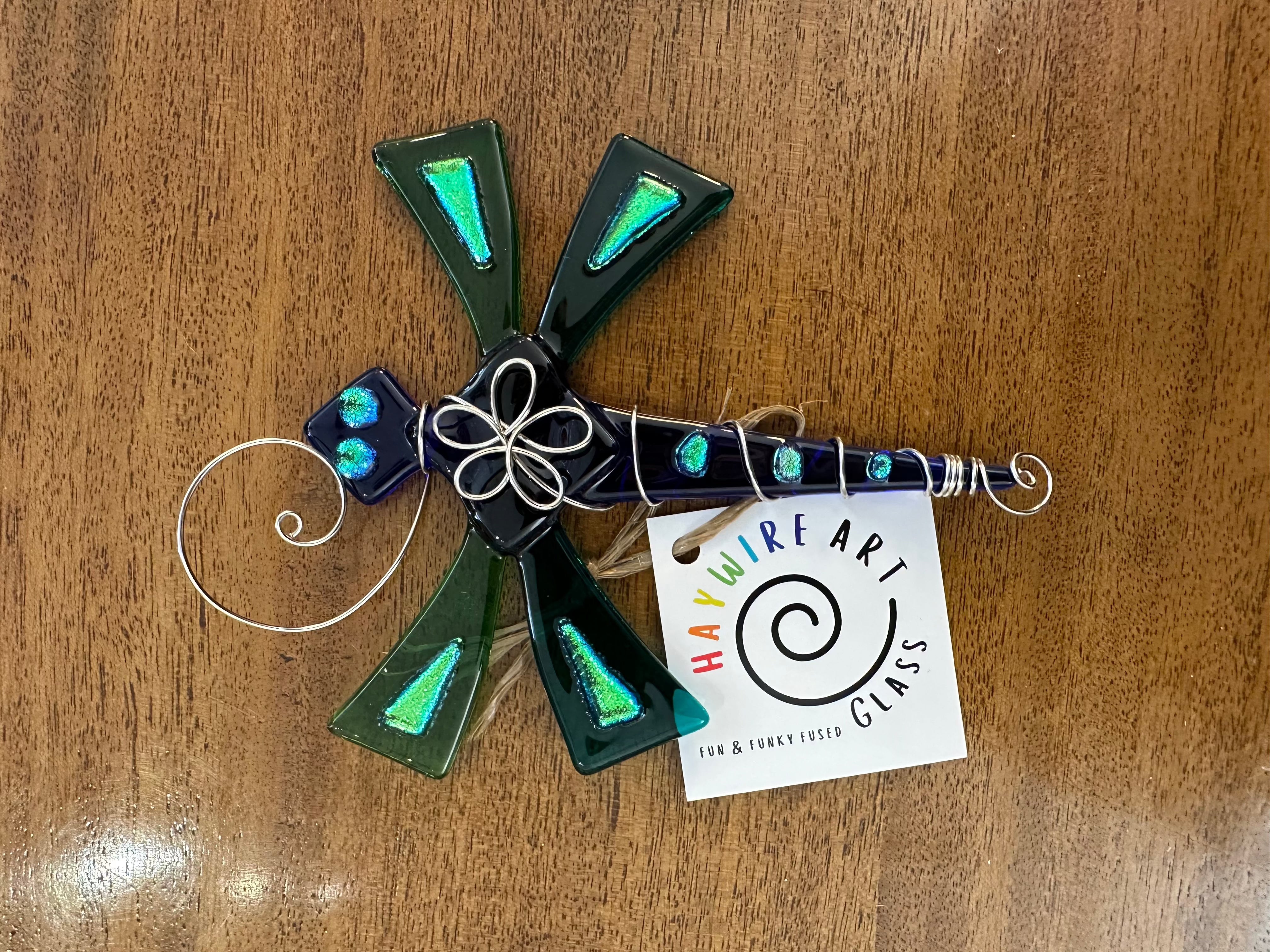 A dragonfly tree ornament to add to your growing collection! This ornament is made with blue and green colored glass for extra dimension! The ornament is finished with dichroic glass and silver wire wrapping.