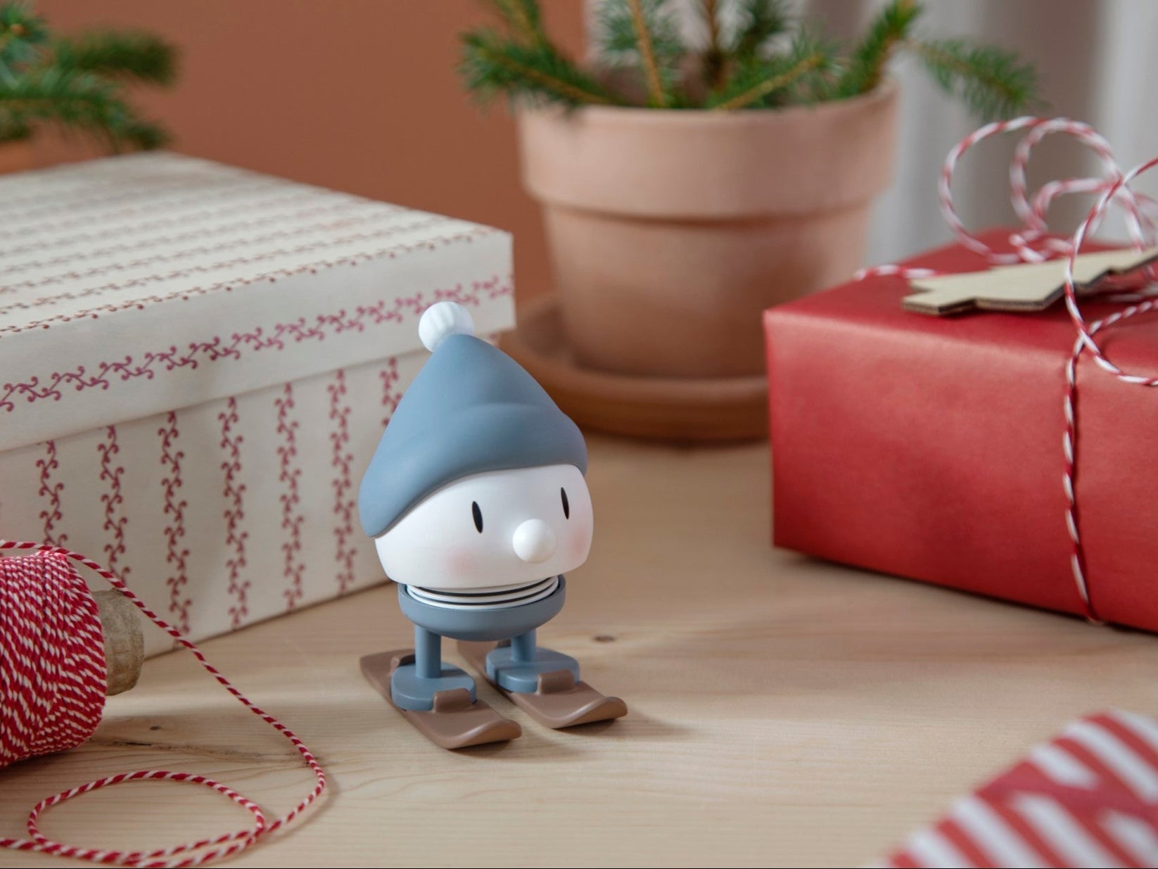 Give the red-cheeked skiing Hoptimist a little nudge and watch him jump for joy over the sparkling white snow on the mountain. Skiing Bumble is ready with his blue top hat - both excited and proud - ready for adventure in the winter landscape. The skis are removable.
