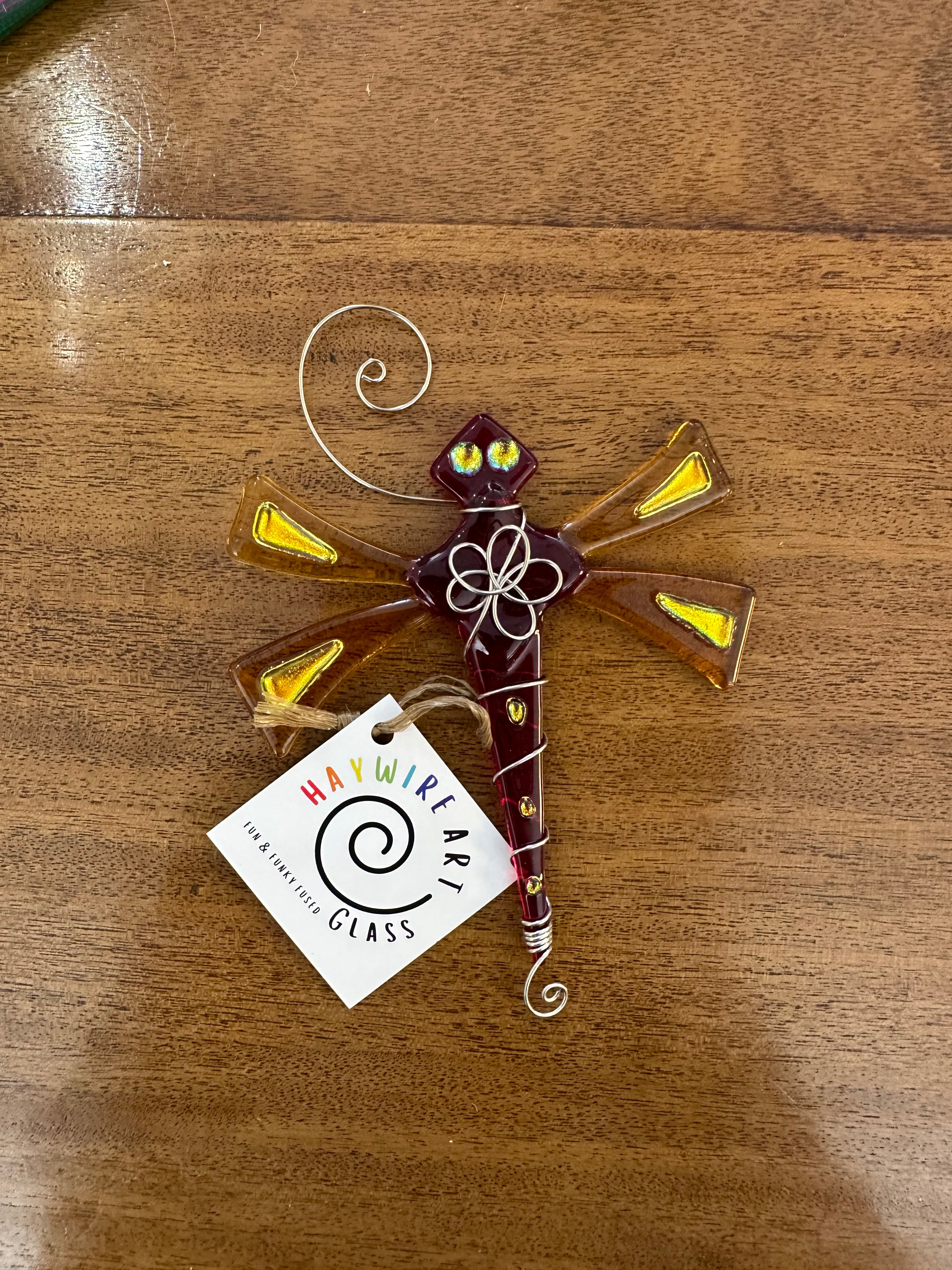 A dragonfly tree ornament to add to your growing collection! This ornament is made with red and yellow colored glass for extra dimension! The ornament is finished with dichroic glass and silver wire wrapping.