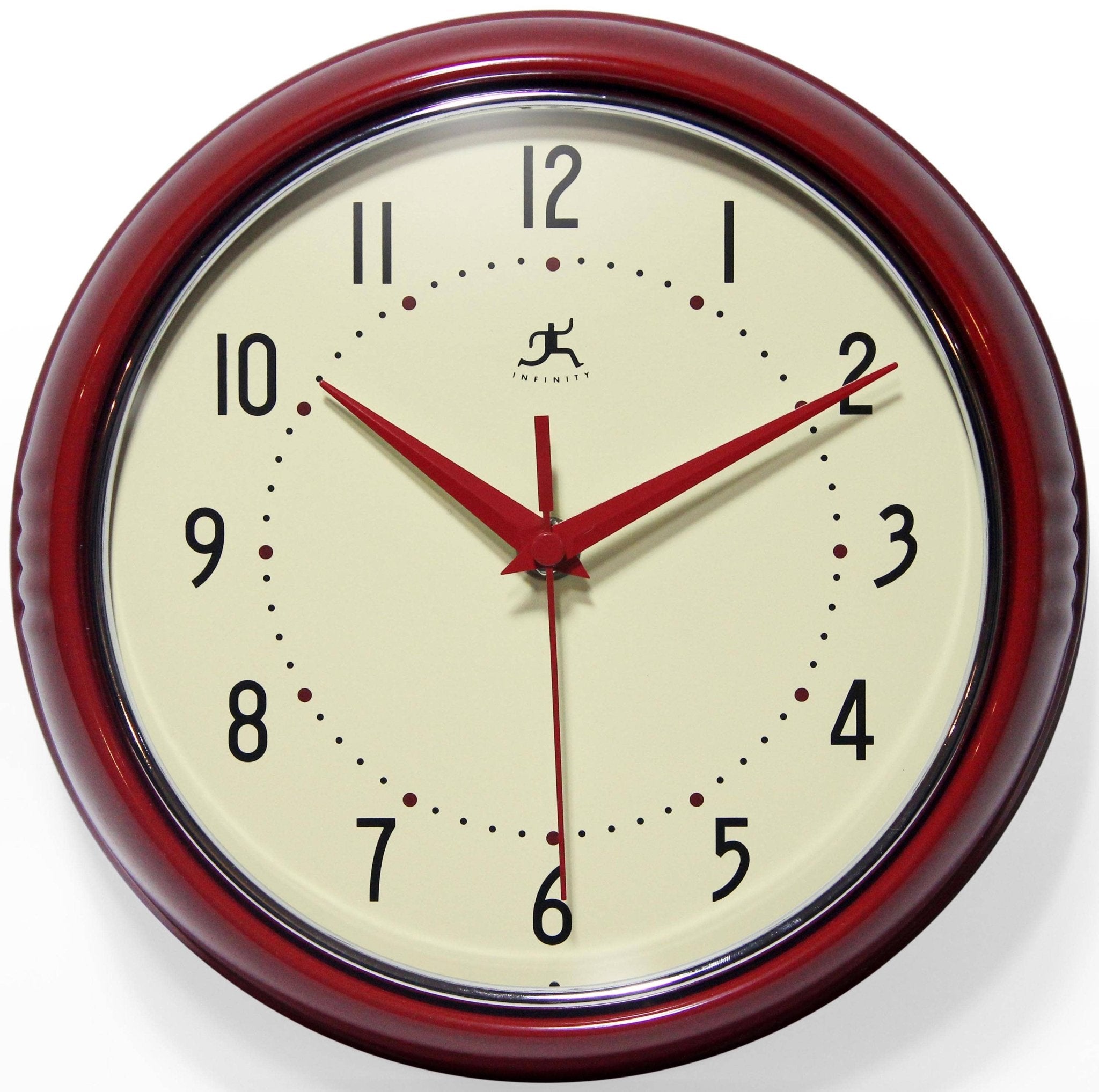 The Retro Round Wall Clock's stunning color frame and unique retro design sets it apart from the rest. Infinity Instruments Retro Wall Clock collection has been a staple in the interior design/wall décor accessories for well over a decade. It has proven the test of time with a clean retro look that fits most, if not all, home décor layouts. There have been many copy-cats but there is only one true Retro Aluminum Wall Clock. Uses 1 AA battery (not included).