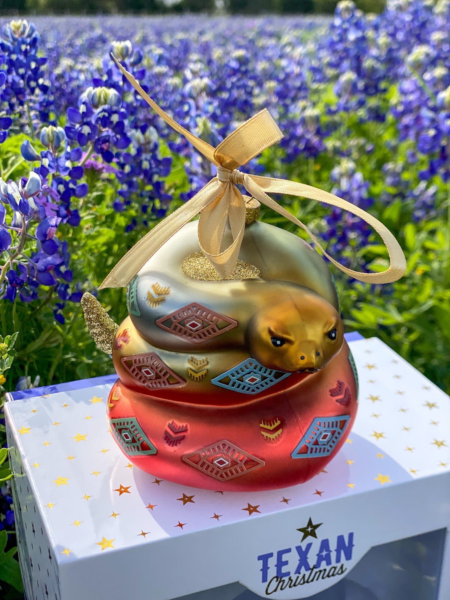 This year's Texas inspired ornament design features an ombre colored Western Diamondback Rattlesnake with western-inspired diamond graphics and a signature black and white striped tail and gold glitter rattle.