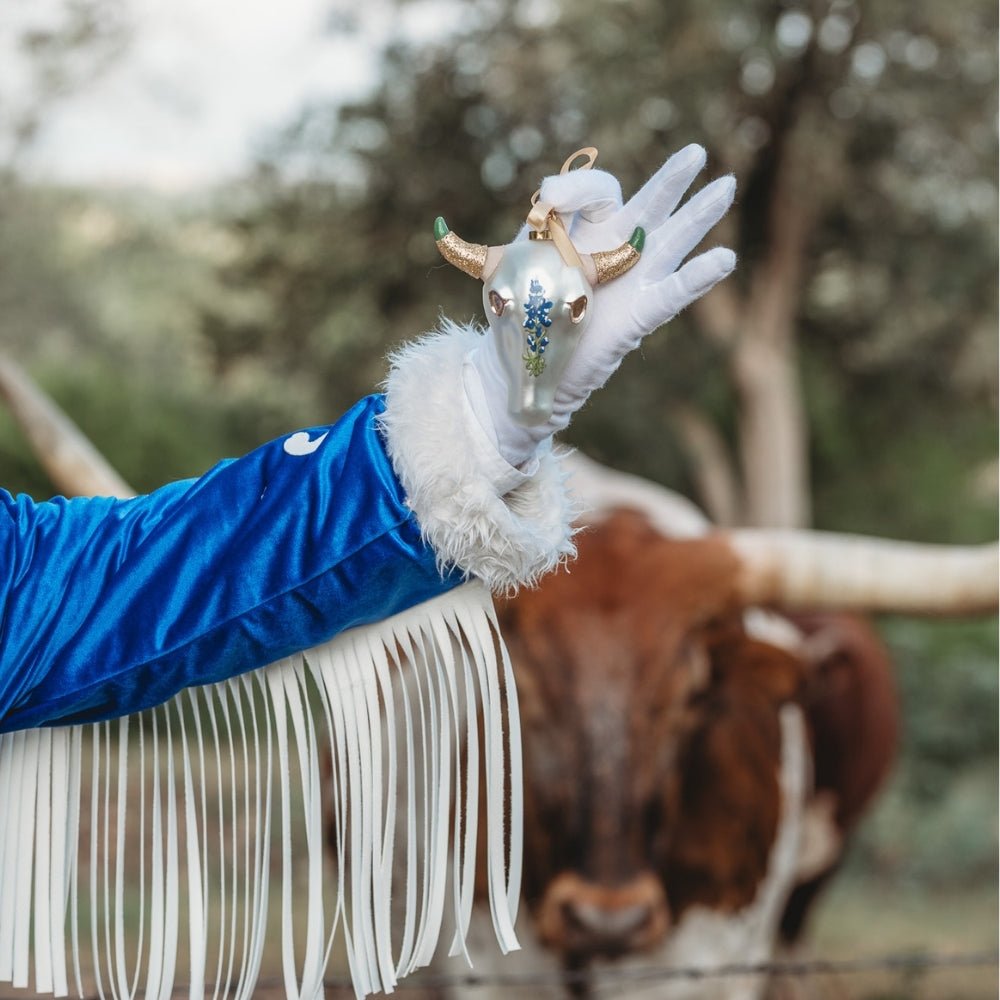 The Texan Christmas Steer Head Skull 2025 Edition is a collectible hand-blown glass Christmas ornament only available for the 2025 holiday season.