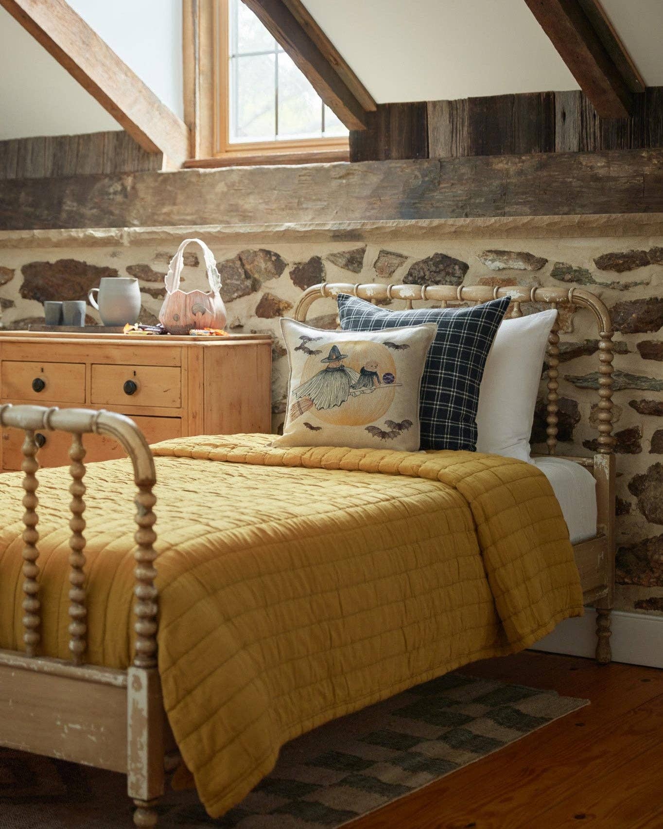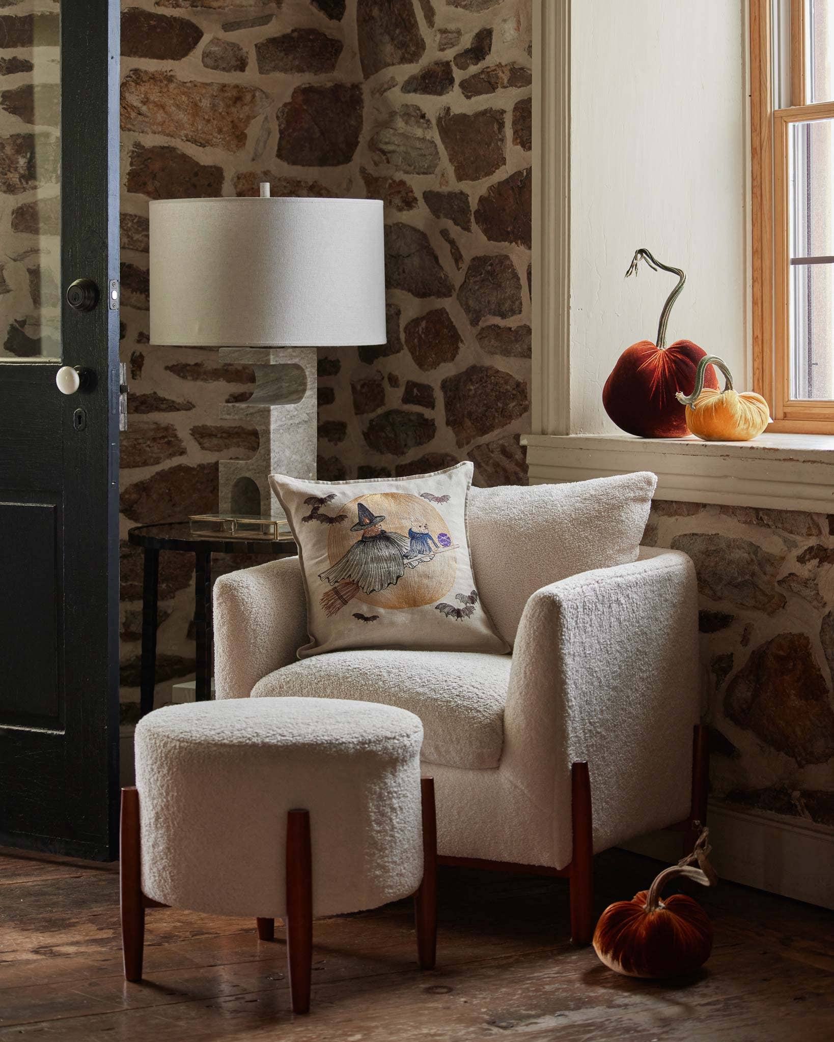 Cast a cute spell on your decor with our Halloween-inspired pillow. Kitty Witch and Wizard Puppy ride atop a flying broomstick as the Supermoon rises on All Hallow’s Eve. Friendly bats flutter around, completing this magical scene.