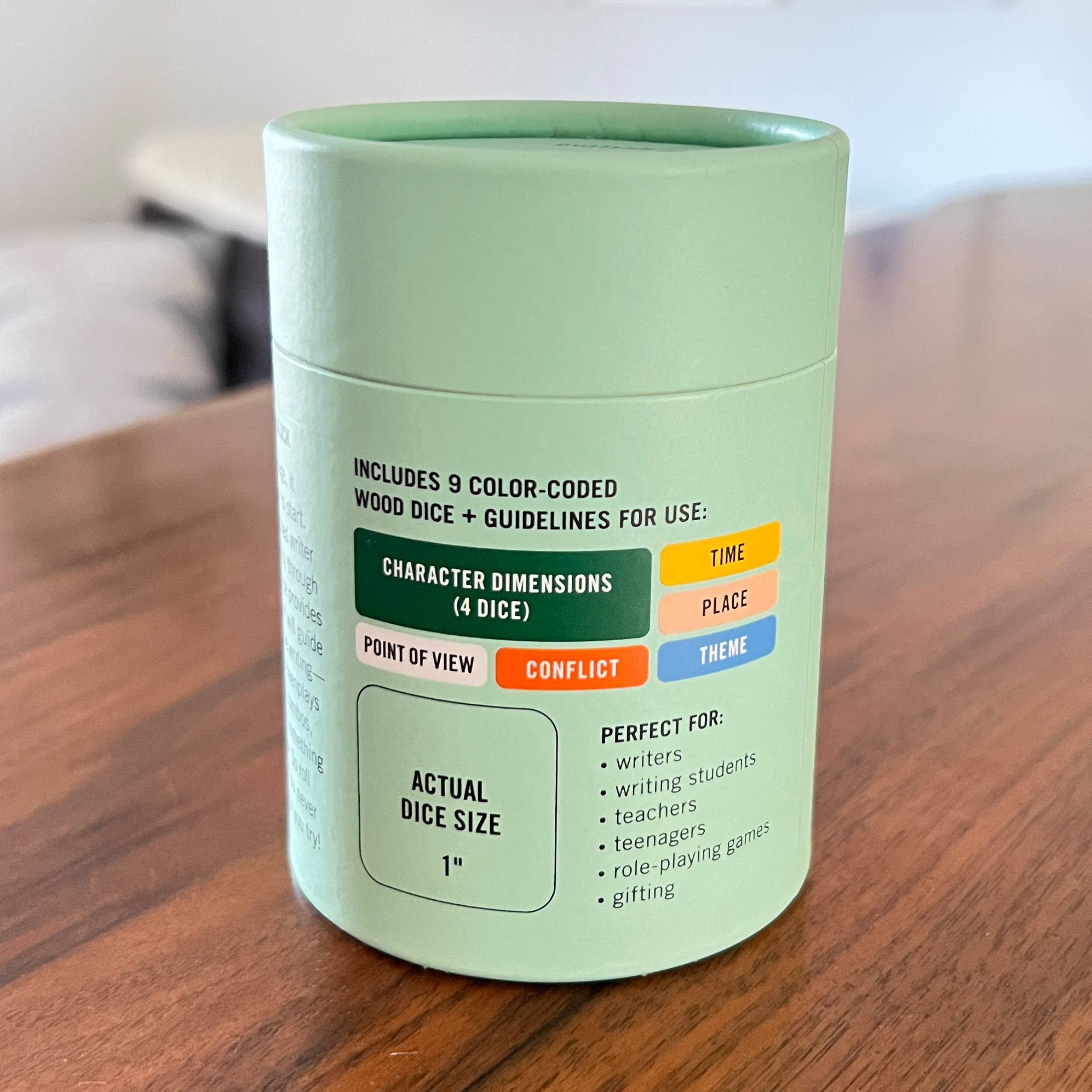 - 9 color-coded wood dice that cover Who, What, When, Where, & Why in depth, as well as an instruction booklet with suggested play variations.